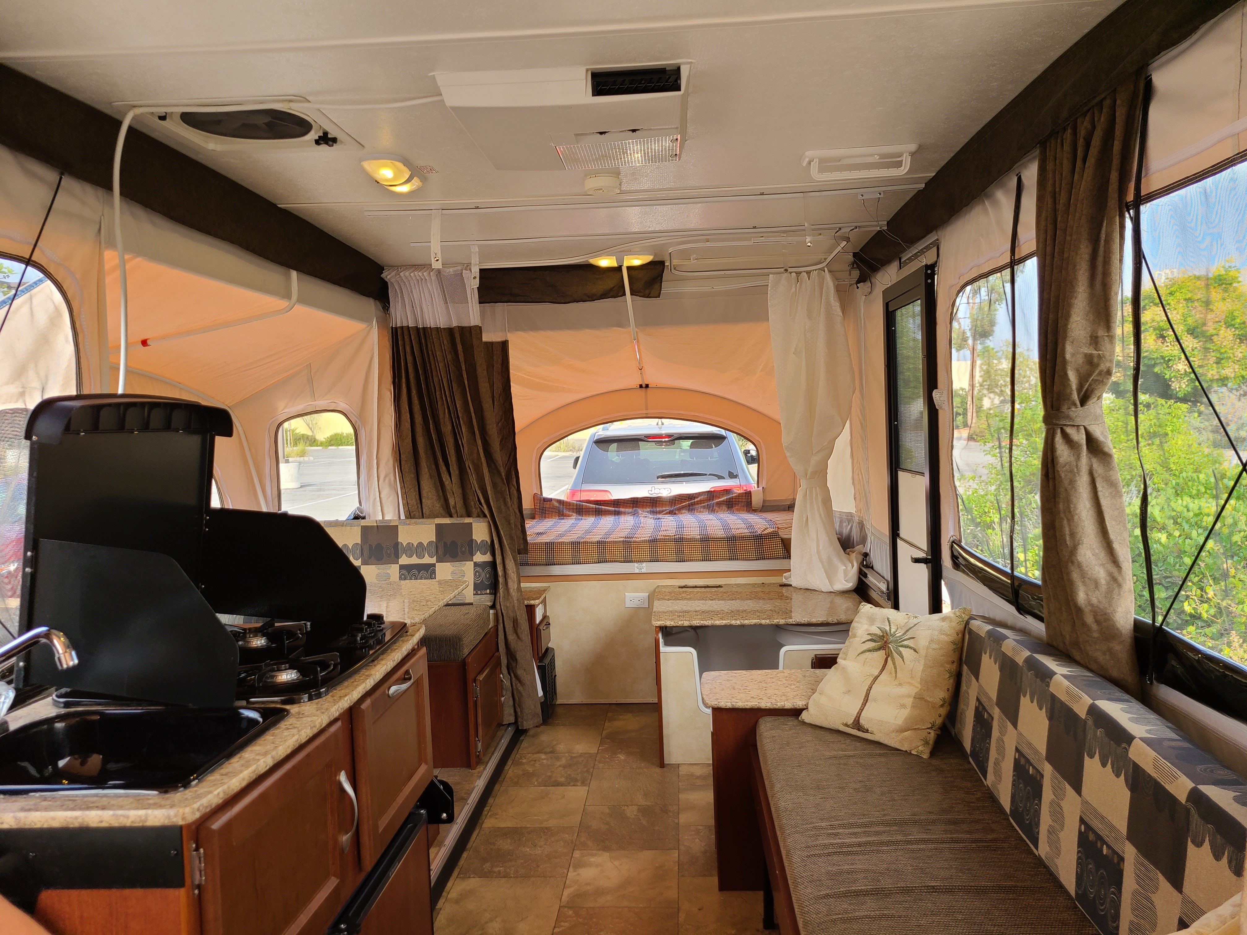Sink 3 burner range w microwave 2 chairs w end table between u dinette sofa slideout w overhead storage above sofa ent.